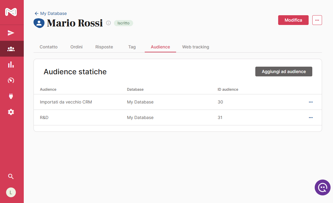 Direttamente da questo tab puoi anche aggiungere il contatto a una o più audience statiche, rendendo la gestione e l’aggiornamento dei segmenti ancora più rapidi. Se non ne hai nessuna, scopri come creare una audience statica visitando la pagina dedicata.