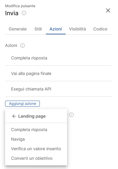Dopo la compilazione della landing page o del survey, puoi infatti decidere quali azioni attivare tramite il pulsante Aggiungi azione: in questo scenario esiste un passaggio successivo da gestire ed è qui che le azioni diventano disponibili, permettendoti di indirizzare il contatto verso un'altra pagina, convertire obiettivi, avviare workflow o tanto altro.