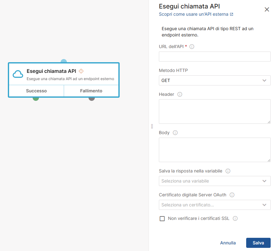 Il nodo permette anche di salvare la risposta della chiamata API all’interno di una variabile di workflow, sia in caso di successo sia in caso di errore.