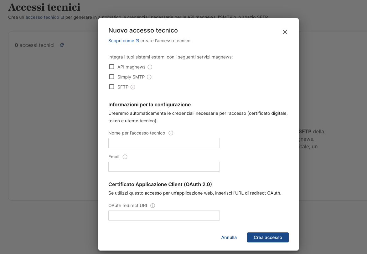 Se stai creando un accesso tecnico per un’applicazione web, potrebbe occorrerti un URL di redirect OAuth. Se al momento non lo conosci, potrai aggiungerlo successivamente modificando il certificato digitale nella sezione API e integrazioni → Certificati digitali.