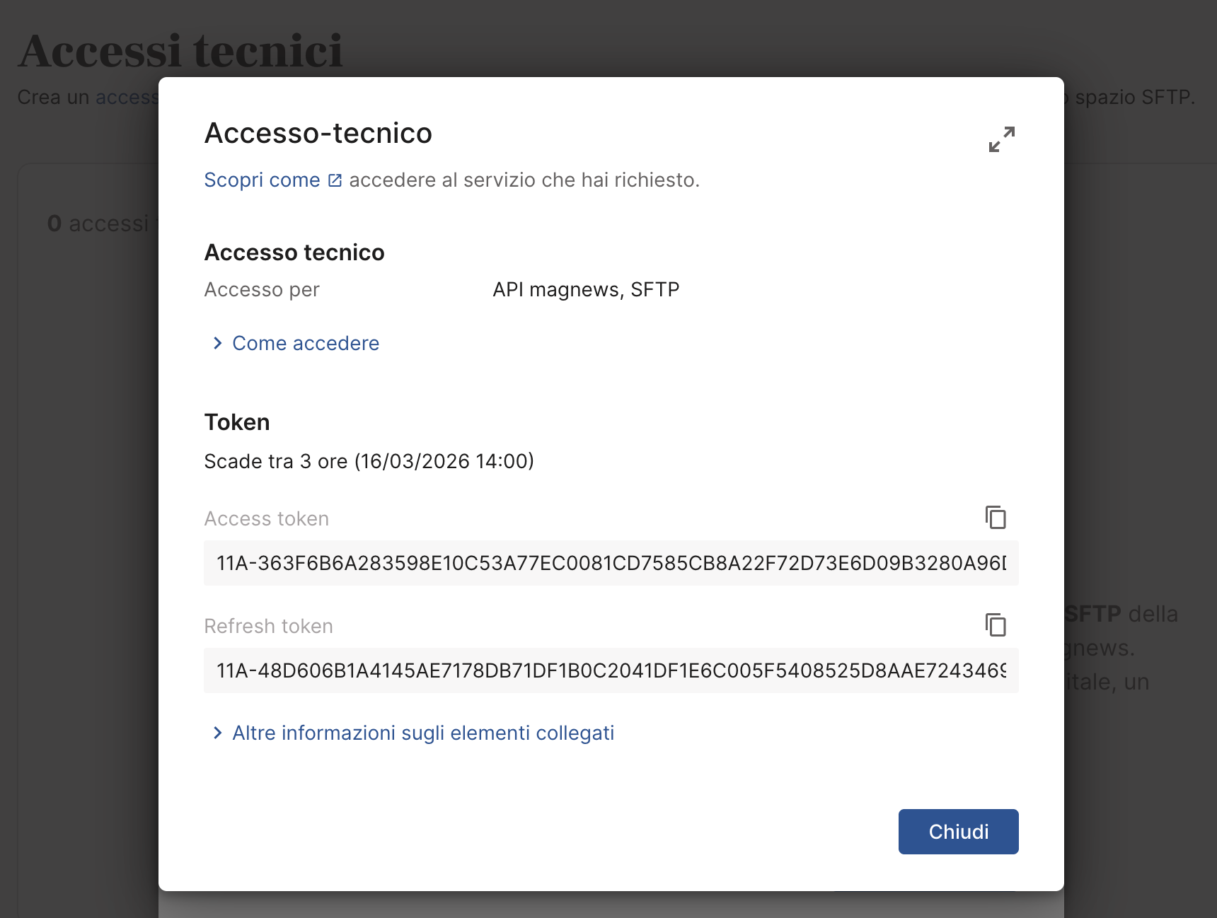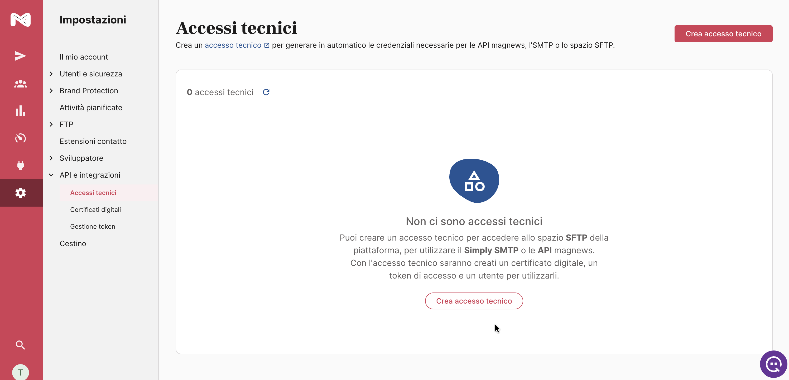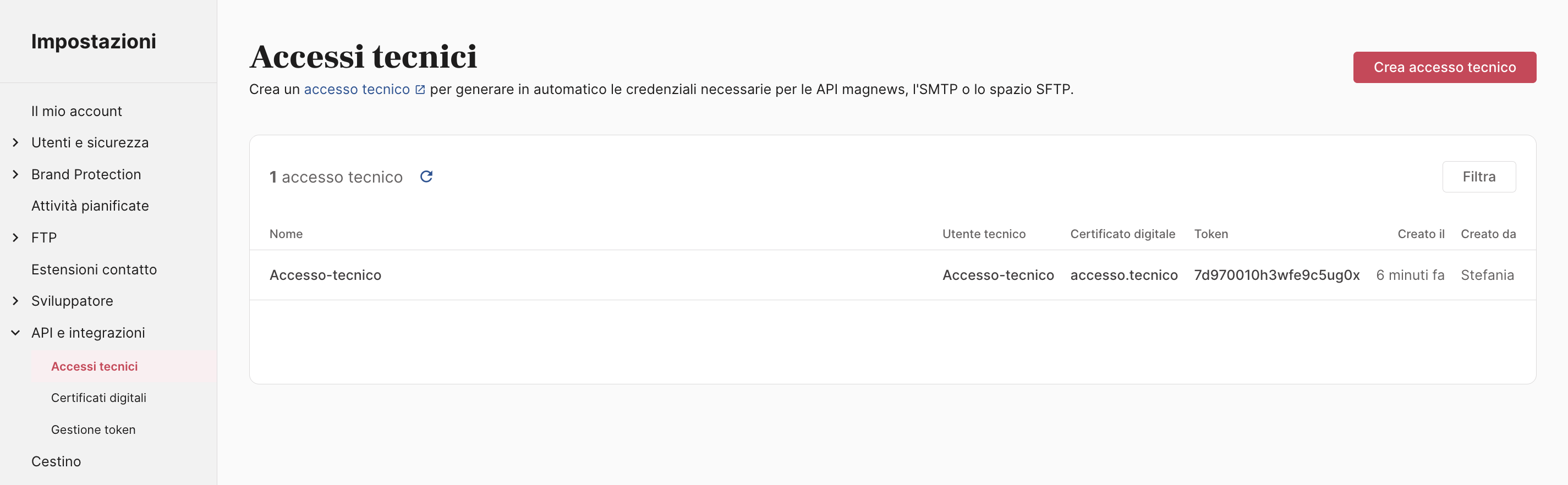 Puoi visualizzare tutti gli accessi tecnici nella sezione: Impostazioni → API e integrazioni → Accessi tecnici.