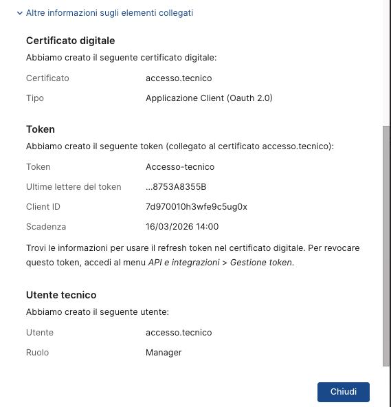 Dopo aver creato un accesso tecnico vedi la pagina con il riepilogo e alcune istruzioni.