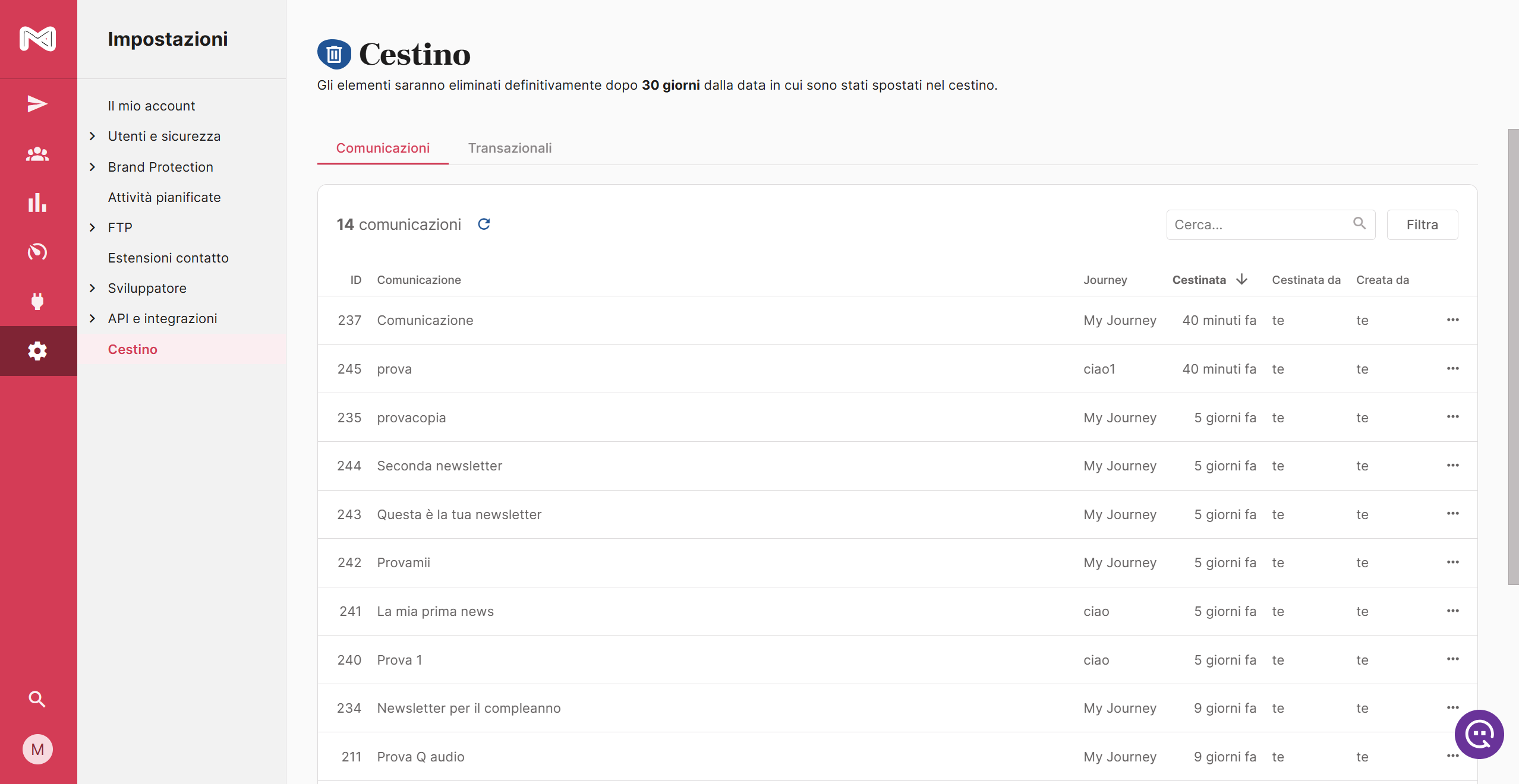 Quando elimini una comunicazione o una transazionale, questa non viene cancellata subito, resta nel cestino per 30 giorni, così puoi recuperarla in qualsiasi momento prima dell'eliminazione definitiva.