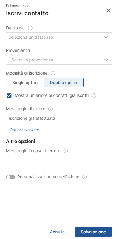 Questa scelta evita che un contatto già iscritto possa completare il form, riceva di nuovo la richiesta di conferma e venga riportato indietro nel processo.Con single opt-in, “Lascia invariati dati e stato degli iscritti”.