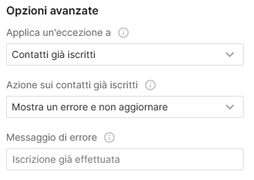 Con double opt-in, “Mostra un errore ai contatti già iscritti”.